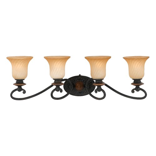 From the Genova Collection by Quoizel, this four light bathroom fixture has warm colors and an elegant design. Features a stonehedge bronze finish with twisted amber scavo glass. Can be mounted up or down.