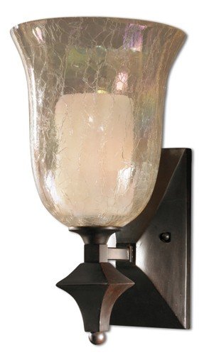- This one light metal wall sconce is lightly distressed with a "spice' finish and has an iridescent crackled glass shade with a white faux candle cover