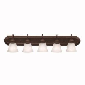 For a classic and clean look in the bath, this bath bar provides fantastic, versatile lighting with flawless precision. The alabaster swirl glass will bring out the best in your bathroom. Itsfive light construction employs 100-watt (max.) bulbs, measures 36' wide by 8' high, can be installed with the glass either up or down, and is U.L. listed for damp location.