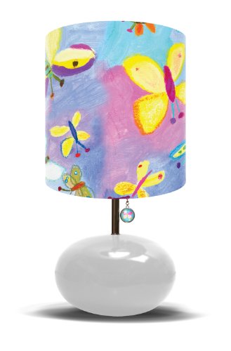 A colorful lamp shade with butterflies fluttering about, over a white base. Approximately 21-Inch tall and 11-Inch wide with fun art shades. Oopsy daisy kids lamps are a unique way to accessorize a room. Lamp shade art by Donna Ingemanson. The gumball shaped base may contain slight variations due to the ceramic firing process.