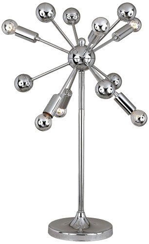 The Supernova table lamp is one of 6 different styles in this collection. The high polished chrome silhouette is enhanced with 6 silver tipped 40-Watt bulbs, which are included. Measuring 19-Inch W by 25-Inch H, this table lamp features an on/off switch at the base.