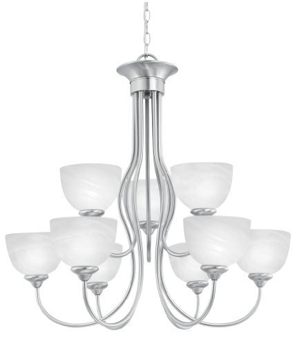 SL801678 Finish: Brushed Nickel Features: -Alabaster style glass shades. Color/Finish: -Painted Bronze Finish. Specifications: -Requires nine 60 watt (Max) bulbs (not included). Dimensions: -Overall Dimensions: 29''-149''H x 30''W. Collection: -Tahoe Collection.