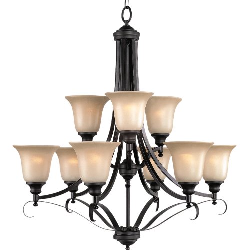 Finish:Oil Rubbed Bronze, Glass Type:Sepia Tinted, Light Bulb:(9)13w Spiral GU24 CFL Classic scrollwork paired with Sepia Tinted glass shades in a tulip silhouette make this an ideal collection for traditional homes.