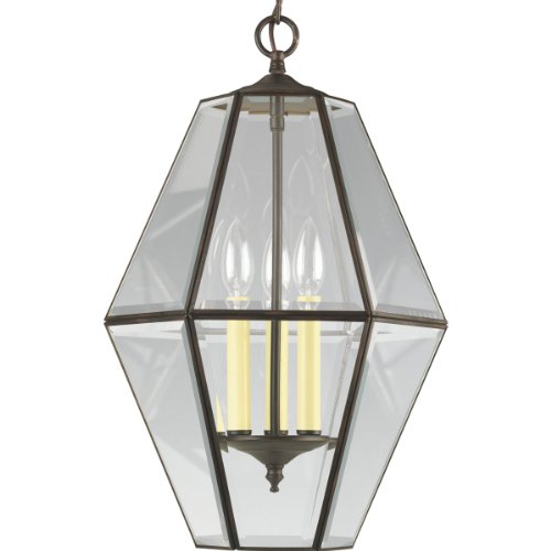 Progress Lighting P3716-20 Six-sided foyer fixture with clear, bound beveled glass. Antique Bronze UL listed for damp locations. Antique Bronze 3-light Foyer Pendant Classic clear beveled, glass fixture bound in brass frame provides an elegant touch to grace your home's entry or stairway. Antique Bronze finish Clear beveled glass 12-1/2 In. Diameter x 20-3/8 In. Height Uses (3) 60-watt candelabra bulbs Listed for damp locations.