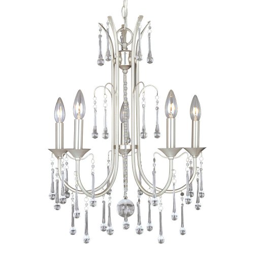 MX2016 Features: -Five light mini chandelier.-UL and CUL listed for dry location.-96'' Silver cord. Construction: -Steel and glass construction. Color/Finish: -Satin nickel finish. Specifications: -Accommodates (5) 60W E12 candelabra base bulb. Dimensions: -Chain length: 72''.-Canopy dimensions: 1'' H x 5'' W.-Overall dimensions: 25'' H x 18'' W x 18'' D.