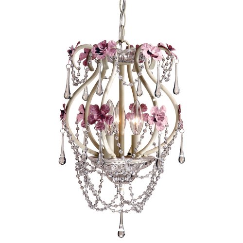PXX211 Features: -Mini pendant.-UL and CUL listed for dry location.-108'' Silver cord. Construction: -Steel and glass construction. Color/Finish: -Eggshell finish.-Bobeche, pink flowers and tear drop accents. Specifications: -Accommodates (3) 60W E12 candelabra base bulb. Dimensions: -Chain length: 72''.-Canopy dimensions: 2.5'' H x 5.75'' W.-Overall dimensions: 17'' H x 11'' W x 11'' D.