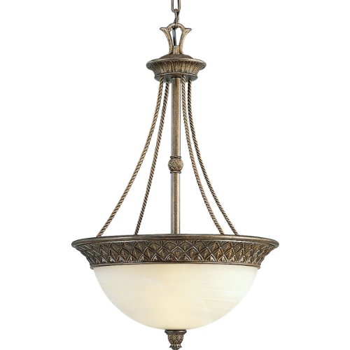 Progress Lighting P3542-86 Three-light foyer with antique alabaster glass and pineapple patterned details Burnished Chestnut Savannah Collection Burnished Chestnut 3-light Chandelier Inspired by the spirit of the British Colonial Isles, the Savannah Collection features a pineapple motif, which is the traditional symbol of hospitality. Fitted with antiqued alabaster glass shades and a rich hand painted finish. Burnished Chestnut finish Antique alabaster glass 17 In. Diameter x 27-1/4 In. Height Uses (3) 100-watt medium base bulbs
