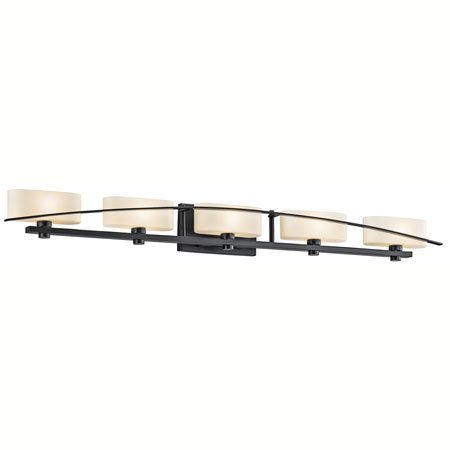 Light Bulb:(5)60w B10 Cand 120v Krypon/Xenon Suspension Five-Light Vanity Sconce Simplicity reigns supreme in this figure. A gentle flowing arch sits cleanly against each fixtures perfect right angles and oval glass shades. A pure black finish adds the final elegant touch.