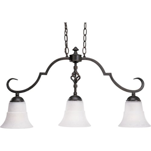 Progress Lighting P4267-84 Three-light linear chandelier with etched water glass. Espresso Melbourne Collection Espresso 3-light Chandelier Strong and distinctively formed, the Melbourne Collection features a classic forged iron frame with traditional birdcage twist. Etched watermark glass shades are lightly textured to cast a soft, diffused light. Espresso finish Etched watermark glass 29-1/4 In. Width x 16 In. Height Uses (3) 60-watt medium base bulbs