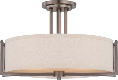 Gemini hazel bronze semi-flush drum with khaki fabric shade and cream diffuser. (3) 60-Watt A19 medium base bulb not included.