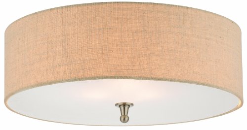 Three-light ceiling fixture in Brushed Nickel finish with bone linen shimmer shades.