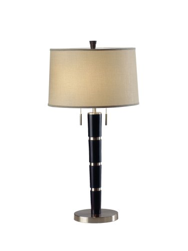 Unique in look and classic in shape the Konico table lamp is a solid design choice. Its dark brown wood and brushed nickel finish feature a cream shade and a dual pull chain switch. This wonderful lamp operates with two 60W medium base bulbs (not included)