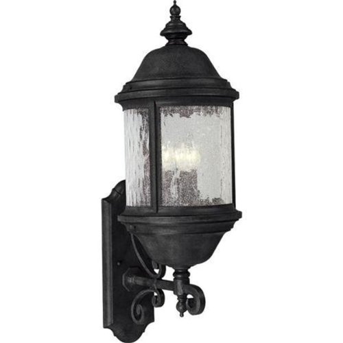 Progress Lighting P5653-31 Three-light cast aluminum wall lantern with water-seeded glass. Textured Black H/CTR 21" Ashmore Collection Textured Black 3-light Wall Lantern Classic old world styling and a durable cast aluminum housing, the Ashmore Collection features a seeded water glass diffuser to reduce glare and to minimize cleaning requirements. Textured Black finish Water seeded glass 9-5/8 In. Width x 28 In. Height Uses (3) 60-watt candelabra bulbs