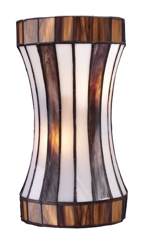 Finish:Black Chrome, Glass:Tiffany Glass, Light Bulb:(2)60w B10 Cand F Incand Delgado 2-Light Sconce The Delgado collection utilizes curved strips form a curvaceous interpretation of the drum shape. Hardware further enriches the appeal. Note: Due to it's hand-made nature, each piece of Tiffany glass will vary slightly in both color and pattern
