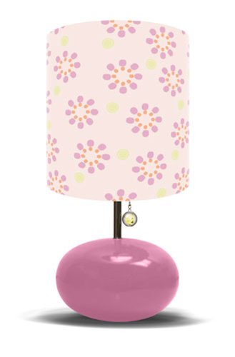 Children's lamp with pink base, pull chain, and floral shade. Approximately 21-Inch tall and 11-Inch wide with fun art shades. Oopsy daisy kids lamps are a unique way to accessorize a room. Lamp shade art by Meghann O'Hara. The gumball shaped base may contain slight variations due to the ceramic firing process.